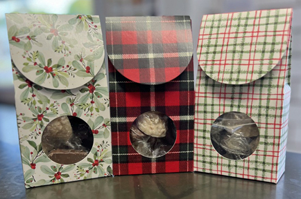 Pretzels coated with milk chocolate. Packed in a 8 oz. cello bag. Seasonally available in Gift Bags with decorative patterns!