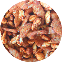 Fresh Roasted Broken Cashews and Hard White Peanuts together are a terrific combination of cashew sweet and hard white crispy. Then we combine a third part of savory Sesame Sticks that are a perfect complement. Finally, over the top with our special cayenne based blend of spices to bring the heat and we have an amazing snack at a value price.