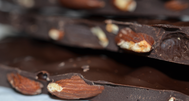 Almonds and semisweet chocolate. We didn't invent it but we perfected it. Taste the difference when the almonds are freshly roasted and lightly salted. Packed in 8 oz. tray and cello wrapped.